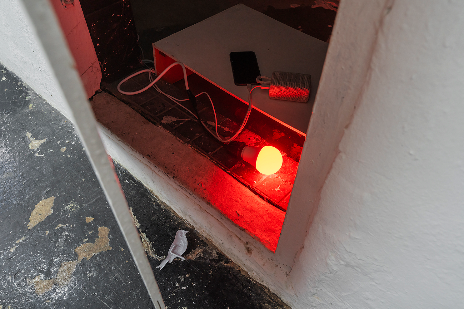 Rather Fine Painting_3, 2024, wood, fallen fake metal bird, red light and two-channel sound(8 hours), dimensions variable, Sound: Hussein Faqih